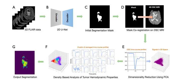 Background: Magnetic resonance imaging (MRI) is a primary non-invasive imaging modality for tumor segmentation, leveraging its exceptional soft tissue contrast and high resolution. Current segmentation methods typically focus on structural MRI, such as T1-weighted post-contrast-enhanced or fluid-attenuated inversion recovery (FLAIR) sequences. However, these methods overlook the blood perfusion and hemodynamic properties of tumors, readily derived from dynamic susceptibility contrast (DSC) enhanced MRI. This study introduces a novel hybrid method combining density-based analysis of hemodynamic properties in time-dependent perfusion imaging with deep learning spatial segmentation techniques to enhance tumor segmentation. Methods: First, a U-Net convolutional neural network (CNN) is employed on structural images to delineate a region of interest (ROI). Subsequently, Hierarchical Density-Based Scans (HDBScan) are employed within the ROI to augment segmentation by exploring intratumoral hemodynamic heterogeneity through the investigation of tumor time course profiles unveiled in DSC MRI. Results: The approach was tested and evaluated using a cohort of 513 patients from the open-source University of Pennsylvania glioblastoma database (UPENN-GBM) dataset, achieving a 74.83% Intersection over Union (IoU) score when compared to structural-only segmentation. The algorithm also exhibited increased precision and localized predictions of heightened segmentation boundary complexity, resulting in a 146.92% increase in contour complexity (ICC) compared to the reference standard provided by the UPENN-GBM dataset. Importantly, segmenting tumors with the developed new approach uncovered a negative correlation of the tumor volume with the scores in the Karnofsky Performance Scale (KPS) clinically used for assessing the functional status of patients (−0.309), which is not observed with the prevailing segmentation standard. Conclusions: This work demonstrated that including hemodynamic properties of tissues from DSC MRI can improve existing structural or morphological feature-based tumor segmentation techniques with additional information on tumor biology and physiology. This approach can also be applied to other clinical indications that use perfusion MRI for diagnosis or treatment monitoring. Keywords: Brain tumor; segmentation; dynamic susceptibility contrast (DSC); perfusion magnetic resonance imaging (perfusion MRI); deep learning